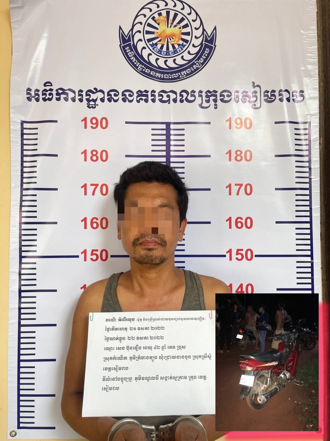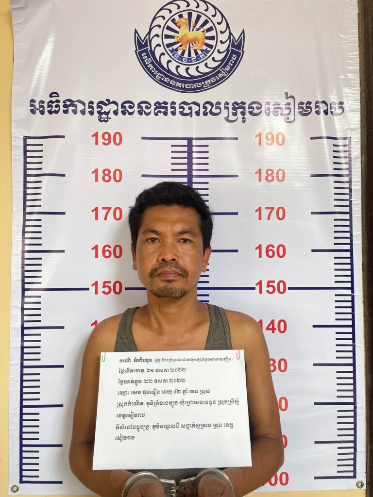 សមត្ថកិច្ចបានឲ្យដឹងថា កម្លាំងនគរបាលមូលដ្ឋាននៃក្រុងសៀមរាប បានឃាត់ខ្លួនជនសង្ស័យឈ្មោះសេង ប៊ុនធឿន ភេទប្រុស អាយុ៤៣ឆ្នាំ មុខរបរមិនពិតប្រាកដ មានស្រុកកំណើតនៅភូមិត្រុំ ឃុំជ្រោយនាងងួន ស្រុកស្រីស្នំ ខេត្តសៀមរាប បច្ចុប្បន្ននៅភូមិមណ្ឌល៣ សង្កាត់ស្លក្រាម ក្រុង/ខេត្តសៀមរាប
