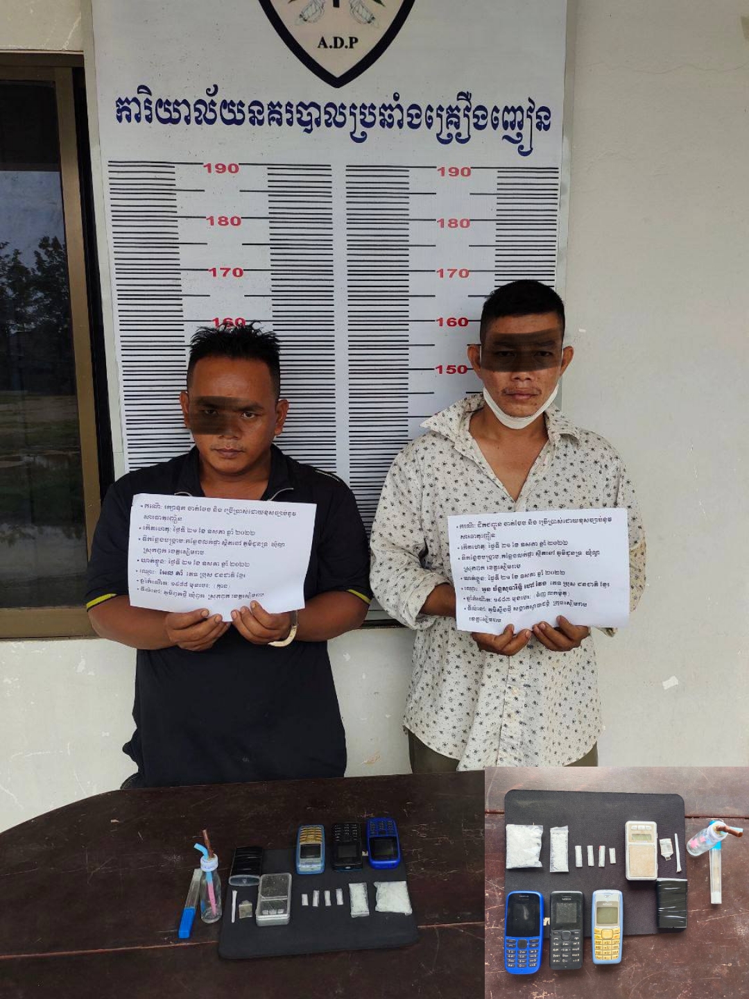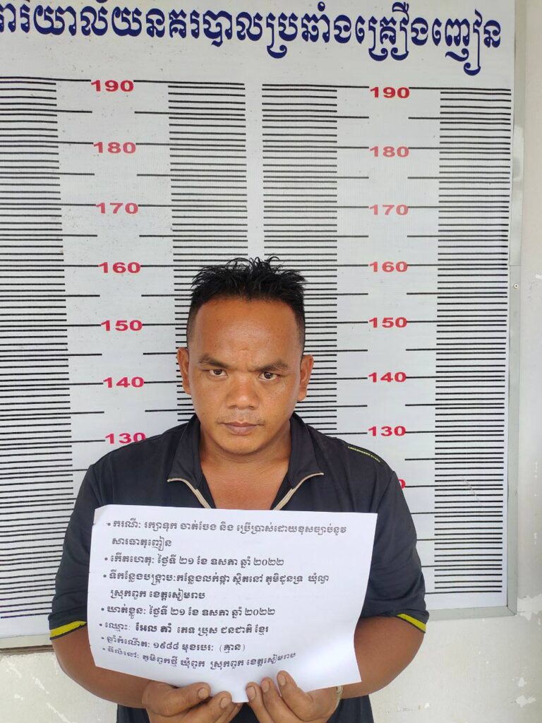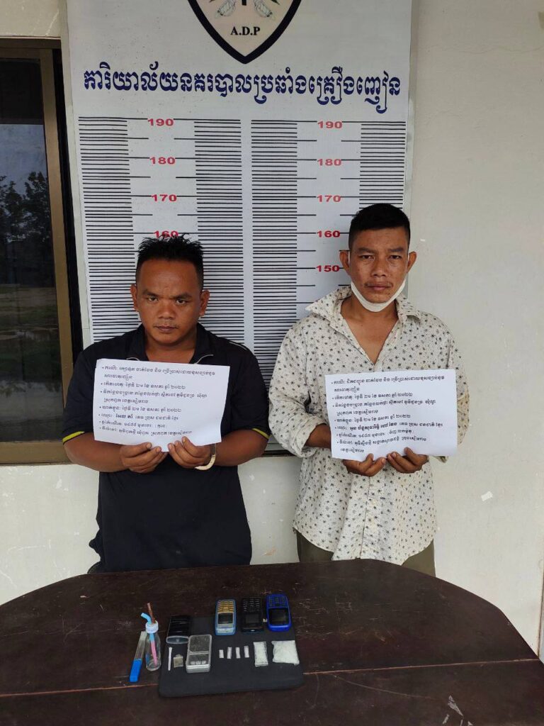 សមត្ថកិច្ចបានឲ្យដឹងថា ឃាត់ខ្លួនជនសង្ស័យចំនួន០២នាក់:១-ឈ្មោះ អូន ចាន់សុធារិទ្ធហៅវែង ភេទប្រុស ឆ្នាំកំណើត ១៩៨៣ ជនជាតិខ្មែរ មុខរបរ ទិញលក់ម៉ូតូ មានទីលំនៅ ភូមិស្ទឹងថ្មី សង្កាត់ស្វាយដង្គំ ក្រុងខេត្តសៀមរាប ។(ពីបទដឹកជញ្ជូន ចាត់ចែង និងប្រើប្រាស់) (មានសារធាតុញៀននៅក្នុងខ្លួន) ។ ២-ឈ្មោះ អែល តាំ ភេទប្រុស ឆ្នាំកំណើត ១៩៨៨ ជនជាតិខ្មែរ មុខរបរ គ្មាន មានទីលំនៅ ភូមិពួកថ្មី ឃុំពួក ស្រុកពួក ខេត្តសៀមរាប ។(ពីបទរក្សាទុក ចាត់ចែង និងប្រើប្រាស់) (មានសារធាតុញៀននៅក្នុងខ្លួន) ។វត្ថុតាងដកហូតរួមមាន៖ម្សៅមេតំហ្វេតាមីនចំនួន០៦កញ្ចប់ ស្មើនឹងទម្ងន់១០ក្រាម(ទម្ងន់សុទ្ធ) ។ជញ្ជីងថ្លឹងគ្រឿងញៀនចំនួន០១គ្រឿង។ឧបករណ៍ប្រើប្រាស់គ្រឿងញៀនមួយចំនួន។ទូរស័ព្ទដៃចំនួន០៣គ្រឿង។ ជនសង្ស័យរួមទាំងវត្ថុតាងត្រូវបានការិយាល័យជំនាញបញ្ជូនទៅសាលាដំបូងខេត្តសៀមរាបថ្ងៃទី ២២ ខែ ឧសភា ឆ្នាំ២០២២៕AFN