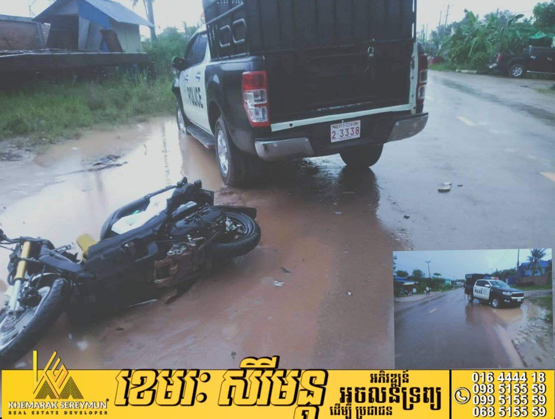 សៀមរាប៖សមត្ថកិច្ចបានដឹងថា រថយន្តនគរបាលប្រឆាំងគ្រឿងញៀននៃស្នងការដ្ឋាននគរបាលខេត្តសៀមរាប បានបុកជាមួយនឹងម៉ូតូ ពេញទំហឹងបណ្ដាលឲ្យរបួសមនុស្សចំនួន៣ នាក់។ហេតុការណ៍នេះកើតឡើងនៅវេលាម៉ោង ១៨និង០០នាទីថ្ងៃ ទី ០១ សីហា ២០២២ ត្រង់ចំណុច ខាងលិច ប៉ុស្តិ៍ជ្រាវ ប្រហែល៥០០ ម៉ែត្រ ស្ថិតក្នុងភូមិវាល សង្កាត់ជ្រាវ ក្រុងសៀមរាប ។