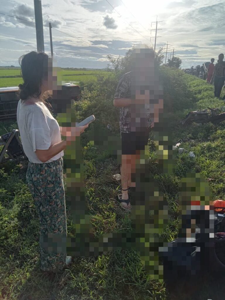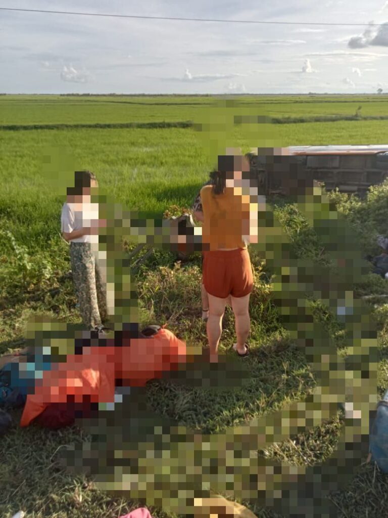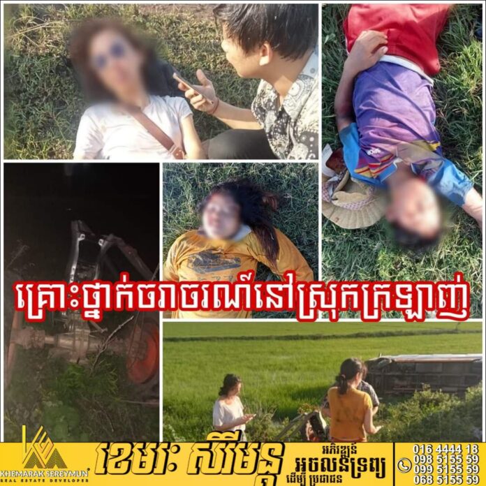 ទី១ឈ្មោះ សាមិន ម៉ាន់ ភេទស្រី អាយុ៦៤ឆ្នាំ ទី២ឈ្មោះ ឆូត ឆវី ភេទស្រី អាយុ៣៩ឆ្នាំ ទី៣ឈ្មោះ គឹម ឆវិន ភេទស្រី អាយុ១៧ឆ្នាំ ទី៤ឈ្មោះ នីវ សានិ ភេទស្រី អាយុ៥០ឆ្នាំ ទី៥ឈ្មោះ គឹម អារាស ភេទប្រុស អាយុ១៣ឆ្នាំ ទី៦ ឈ្មោះ ពេជ្រ លីណា ភេទស្រី អាយុ២០ឆ្នាំ ទី៧ឈ្មោះ ទឿន ពន្លា ភេទប្រុស អាយុ០៩ឆ្នាំ ទី៨ឈ្មោះ ចយ ភេទប្រុស អាយុ២០ឆ្នាំ រស់នៅភូមិឃុំជាមួយអ្នកបើកបរគោយន្តកន្ត្រៃខាងលើទាំងអស់គ្នា។លោកបន្ត បណ្ដាលឲ្យស្លាប់មនុស្ស ០៣ នាក់ឈ្មោះ សាមិន ម៉ាន់.គឹម កាន .ឆូត ឆវី។លោកបន្ថែមថា របួសធ្ងន់ ០៤នាក់ឈ្មោះ គឹម ឆវិន .នីវ សានិ .គឹម អារាស ពេជ្រ លីណា ,របួសមនុស្សស្រាល ០៣នាក់ឈ្មោះ ទឿន ពន្លា .ចយ. ហេង ឆាយហុក និងរបួសជនជាតិស្រាល ចំនួន០៨ នាក់ ស្រី ០៥នាក់។ខូចរថយន្តធ្ងន់ ០១គ្រឿង និងគោយន្តកន្ត្រៃមួយគ្រឿង។លោកបញ្ជាក់ថា មូលហេតុ គ្រោះថ្នាក់ចរាចរណ៍ បណ្តាលមកពី អ្នកបើកបរ រថយន្តមិនប្រកាន់ស្តាំ។