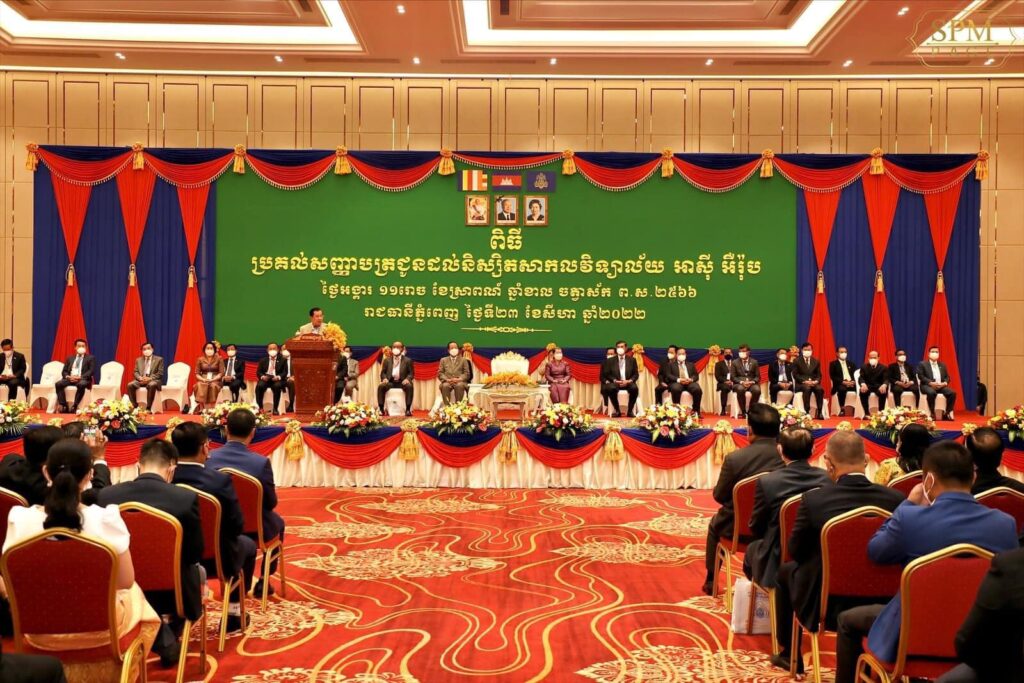 ភ្នំពេញ៖នាព្រឹកថ្ងៃទី២៣ ខែសីហា ឆ្នាំ២០២២នេះ សម្តេចអគ្គមហាសេនាបតីតេជោ ហ៊ុន សែន នាយករដ្ឋមន្ត្រីនៃព្រះរាជាណាចក្រកម្ពុជា បានអញ្ជើញប្រគល់សញ្ញាបត្រ ជូននិស្សិតជយលាភីរបស់សាកលវិទ្យាល័យអាស៊ី-អឺរ៉ុបប្រមាណ ៣,០៧៥នាក់។