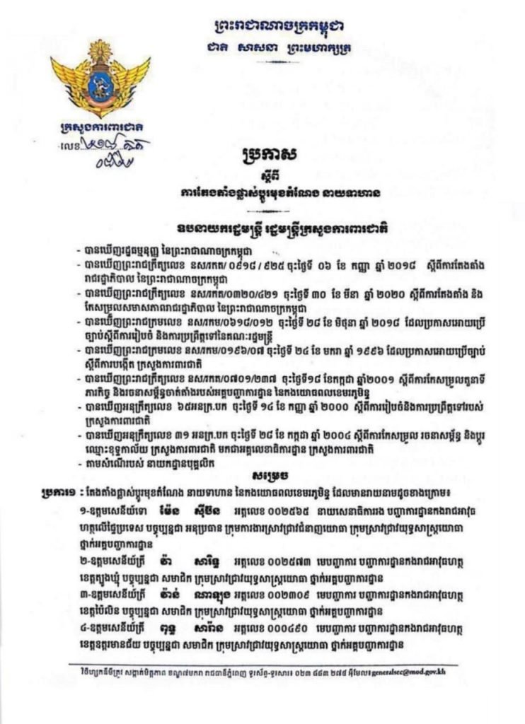 ភ្នំពេញ៖យោងតាមប្រកាសរបស់ក្រសួងការពារជាតិដែលទើបចេញផ្សាយនៅរសៀលថ្ងៃទី២៣សីហានេះ បានឲ្យដឹងថា សម្តេចពិជ័យសេនា ទៀ បាញ់ ឧបនាយករដ្ឋមន្ត្រី រដ្ឋមន្ត្រីក្រសួងការពារជាតិបានធ្វើការប្រកាសផ្លាស់ប្តូរតំណែងមេបញ្ជាការដ្ឋានកងរាជអាវុធហត្ថចំនួន៧ខេត្តដើម្បីពង្រឹងប្រសិទ្ធភាពការងារឱ្យកាន់តែប្រសើរឡើងថែមទៀត។