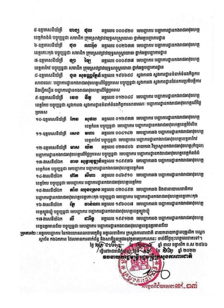 លោក ឧត្តមសេនីយ៍ត្រី ពុទ្ធ សារ៉ាន មេបញ្ជាការដ្ឋានកងរាជអាវុធខេត្តឧត្តរមានជ័យទៅជាសមាជិកក្រុមការងារស្រាវជ្រាវយុទ្ធសាស្ត្រយោធាថ្នាក់អគ្គមេបញ្ជាការនិងបានតែងតាំងលោកវរសេនីយ៍ឯក លីដារឹទ្ធមេបញ្ជាការរងជាមេបញ្ជាការដ្ឋានកងរាជអាវុធខេត្តប៉ៃលិន។លោក ឧត្តមសេនីយ៍ត្រី ហង្សថុល មេបញ្ជាការដ្ឋានកងរាជអាវុធខេត្តកំពង់ធំទៅជាសមាជិកក្រុមការងារស្រាវជ្រាវយុទ្ធសាស្ត្រយោធាថ្នាក់អគ្គមេបញ្ជាការនិងបានតែងតាំងលោក ឧត្តមសេនីយ៍ត្រីមាសយ៉ត នាយករងវិទ្យាស្ថានកងរាជអាវុធហត្ថកំបូលជាមេបញ្ជាការដ្ឋានកងរាជអាវុធខេត្តកំពង់ធំ។លោកឧត្តមសេនីយ៍ឯក ថុង ណារ៉ុង មេបញ្ជាការដ្ឋានកងរាជអាវុធខេត្តកោះកុងទៅជាសមាជិកក្រុមការងារស្រាវជ្រាវយុទ្ធសាស្ត្រយោធាថ្នាក់អគ្គមេបញ្ជាការនិងតែងតាំងលោកវរសេនីយ៍ឯក តាំងឈុន ស្រេង ពីមេបញ្ជាការរងនិងជានាយសេនាធិការដ្ឋានកងរាជអាវុធខេត្តកោះកុងទៅជាមេបញ្ជាការដ្ឋានកងរាជអាវុធខេត្តកោះកុង។លោក ឧត្តមសេនីយ៍ត្រី ឡាឡៃ មេបញ្ជាការដ្ឋានកងរាជអាវុធខេត្ត តាកែវទៅជាសមាជិកក្រុមការងារស្រាវជ្រាវយុទ្ធសាស្ត្រយោធាថ្នាក់អគ្គមេបញ្ជាការនិងតែងតាំងលោក ឧត្តមសេនីយ៍ត្រី សេង ហា មេរបញ្ជាការរងទៅជាមេបញ្ជាការដ្ឋានកងរាជអាវុធខេត្ត តាកែវ។លោក ឧត្តមសេនីយ៍ត្រី ខេងទីតូ មេបញ្ជាការដ្ឋានកងរាជអាវុធខេត្តកែបទៅជាស្នងការរងនៃស្នការដ្ឋានទំនាក់ទំនងសាធាររណៈបញ្ជាការដ្ឋានកងរាជអាវុធហត្ថលើផ្ទៃប្រទេសនិងបានតាំងតាំងលោកវរសេនីយ៍ឯក ហ៊ត សីហា មេបញ្ជាការរងទៅជាមេបញ្ជាការដ្ឋានកងរាជអាវុធខេត្តកែប។