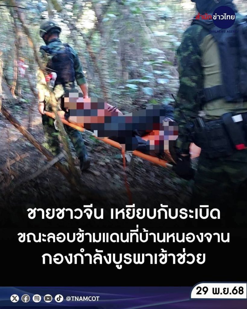 ភ្នំពេញ៖នៅព្រឹកថ្ងៃទី២៩ ខែវិច្ឆិកា ឆ្នាំ២០២៥ កងយោធភូមិភាគទី១ ថៃ បានរាយការណ៍ថា មានបុរសជនជាតិចិន កាន់លិខិតឆ្លងដែនឈ្មោះ SHI JINGUI អាយុ ២៦ឆ្នាំ មកពីខេត្តយូណាន ប្រទេសចិន បានរងរបួសដោយសារដើរជាន់មីន បន្ទាប់ពីឆ្លងកាត់ព្រំដែន ចូលទៅក្នុងប្រទេសថៃនៅជិត ភូមិបានណងចាន់ ស្រុក Khok Sung ខេត្តស្រះកែវ ។