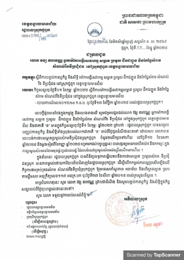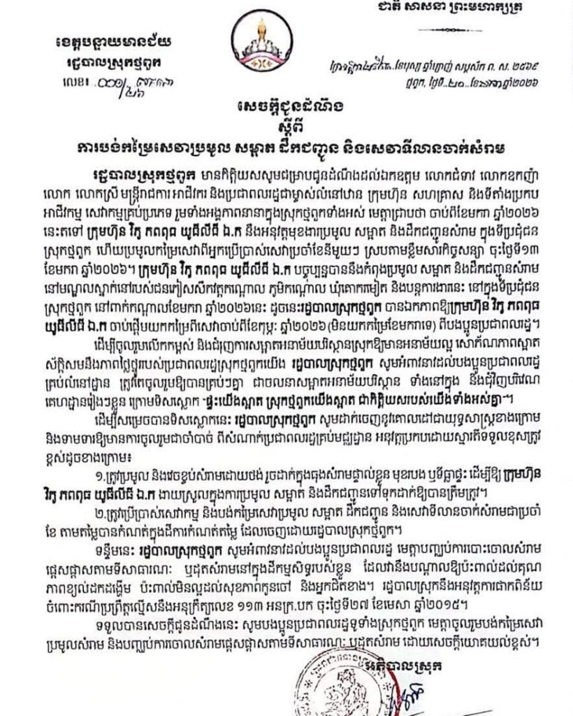 លោកបន្ត រដ្ឋបាលស្រុកថ្មពួក បានសម្រេច បញ្ឈប់កាតព្វកិច្ច និងសិទ្ធិទាំងស្រុងរបស់លោកជាភាគី “ខ” ចាប់ពីថ្ងៃជូនដំណឹងនេះតទៅ ដោយសារ លោកបាន បោះបង់ការងារសម្អាតប្រមូលសំរាមទីប្រជុំជនស្រុកថ្មពួក ចំនួន២លើករួចទៅហើយ នៅថ្ងៃទី១២ ខែឧសភា ឆ្នាំ២០២៥ និងម្តងទៀតពីខែកញ្ញា ឆ្នាំ២០២៥ រហូតមកដល់បច្ចុប្បន្ននេះ បានបង្ករឲ្យមានភាពយឺតយ៉ាវ និងកកស្ទះ ក្នុង ការប្រមូលសំរាមមាននៅតាមមុខផ្ទះប្រជាពលរដ្ឋ ដែលបង់សេវាប្រមូលសំរាមជាច្រើននាបើកមកហើយ ។