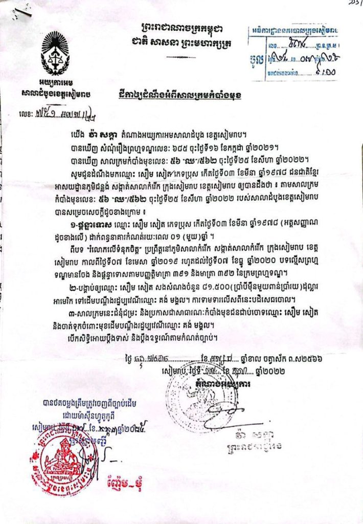 ខេត្តសៀមរាប៖យោងតាមដីកាឲ្យដំណឹងអំពីសាលក្រមកំបាំងមុខ ដែលចេញដោយលោក វ៉ា សក្កា តំណាងអយ្យការអមសាលាដំបូង ខេត្តសៀមរាប។បានឃើញ សំណុំរឿងព្រហ្មទណ្ឌលេខៈ ៦៨៥ ចុះថ្ងៃទី១៦ ខែកក្កដា ឆ្នាំ២០២១។បានឃើញ សាលក្រមកំបាំងមុខលេខៈ ៥៦ “ឈ៥៦២ ចុះថ្ងៃទី២៥ ខែសីហា ឆ្នាំ២០២២។